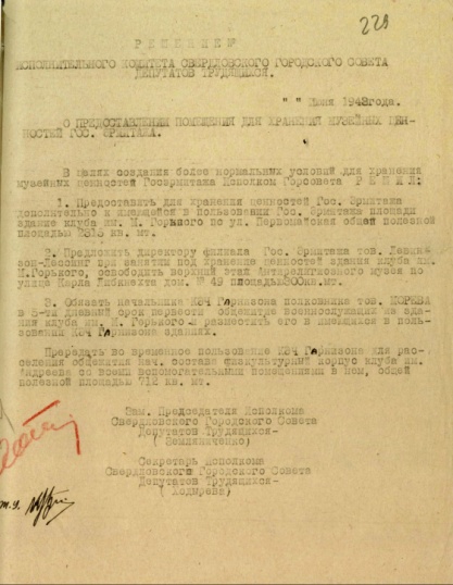 "Предоставить для хранения ценностей Гос. Эрмитажа дополнительно к имеющейся в пользовании…здание клуба им. М.Горького по ул. Первомайская"ГАСО. Ф.Р-286. Оп. 1. Д. 1024. Л. 229