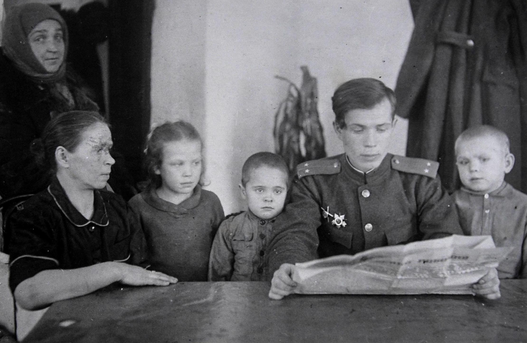 Вернувшийся боец Красной Армии в кругу семьи. 1945 г. ГАСО. Ф. Ф-1. Оп. 50. Д. 43а.