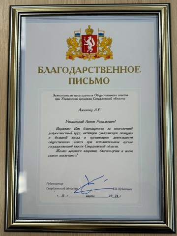 Мероприятие прошло в культурно-выставочном центре «Синара Центр». Здесь Заместитель Губернатора Свердловской области Креков Павел Владимирович вручил Антону Равильевичу Благодарственное письмо Губернатора Свердловской области Евгения Куйвашева за многолетний добросовестный труд, активную гражданскую позицию и большой вклад в организацию деятельности общественного совета при исполнительном органе государственной власти Свердловской области.