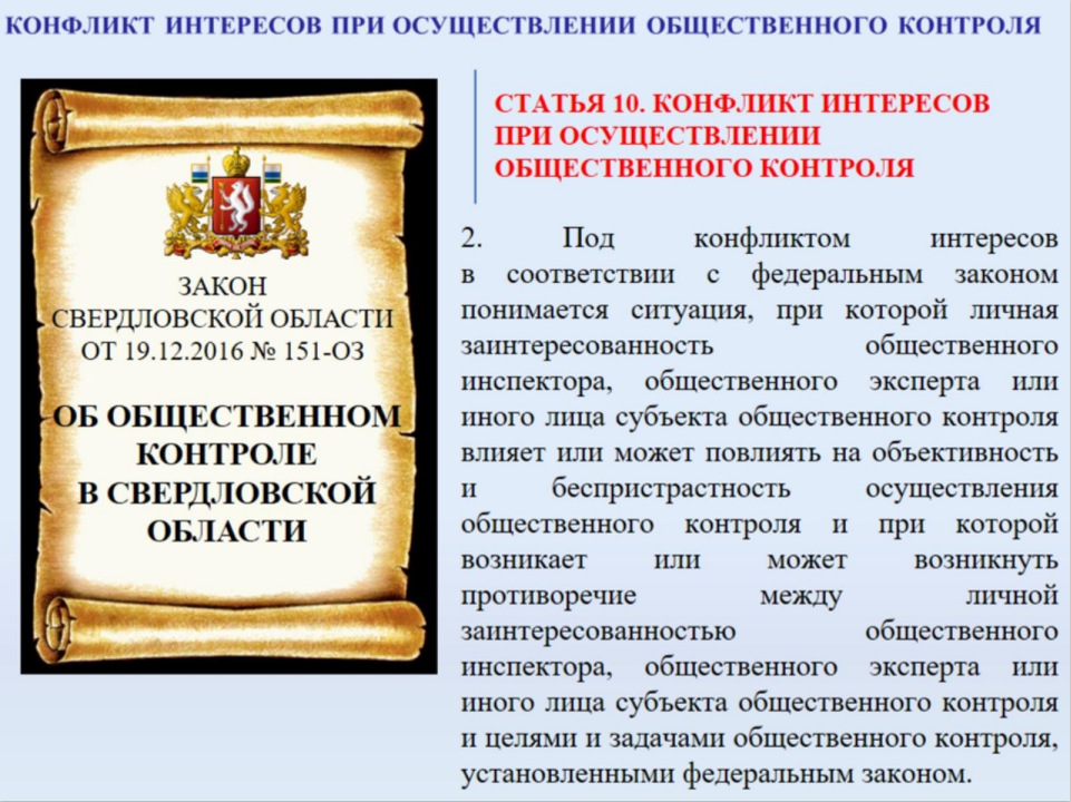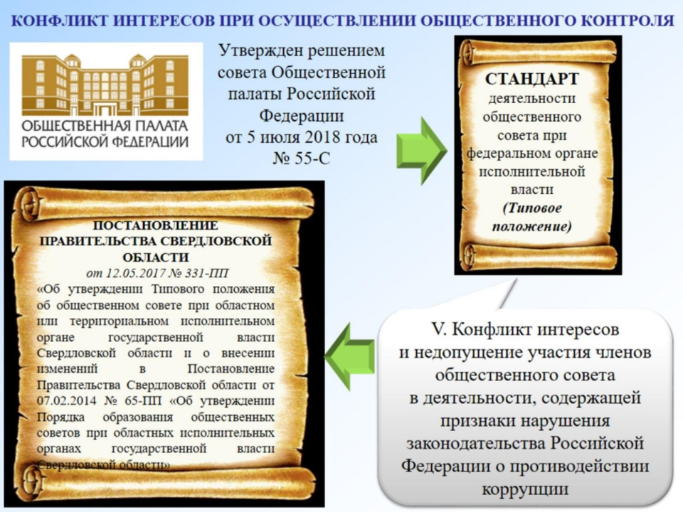 В целях реализации главы 8 Типового положения об общественном совете при областном или территориальном исполнительном органе государственной власти Свердловской области, утвержденного постановлением Правительства Свердловской области от 12.05.2017 № 331-ПП, до членов совета доведена информацию о конфликте интересов при осуществлении общественного контроля и недопущению участия членов общественного совета в деятельности, содержащей признаки нарушения законодательства Российской Федерации о противодействии коррупции.