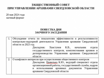 28.05.2024 состоялось очередное заседание общественного совета при Управлении архивами Свердловской области в заочном формате.