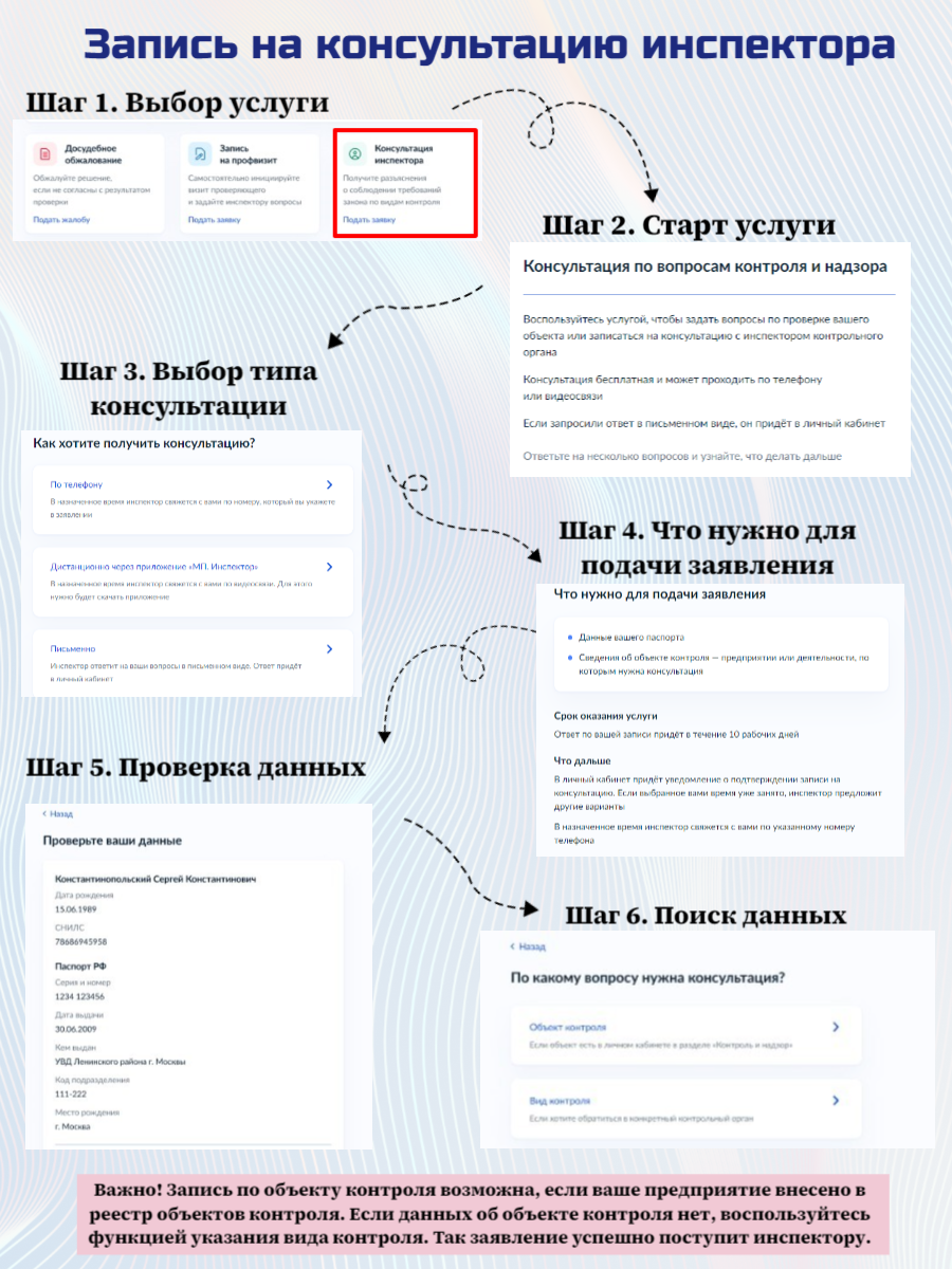 Большинство данных заполняются автоматически из профиля организации или физического лица. Вам останется выбрать время и способ консультирования: через мобильное приложение «Инспектор», либо по телефону (инспектор сам позвонит), либо письменно.