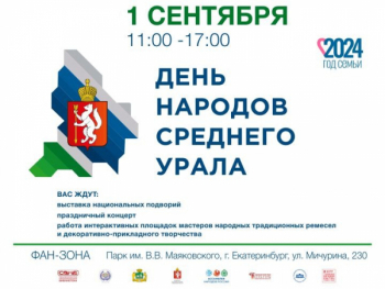 1 сентября 2024 года с 11.00 до 17.00 на территории фан-зоны муниципального автономного учреждения культуры «Екатеринбургский центральный парк культуры и отдыха имени В.В. Маяковского» (г. Екатеринбург, ул. Мичурина, д. 230) будет проводиться Областной праздник, посвященный Дню народов Среднего Урала.