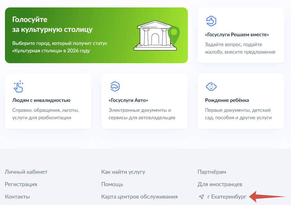 Шаг 1. Внизу главной страницы портала «Госуслуги» необходимо нажать значок геопозиции, который автоматически отображает ваше текущее местоположение