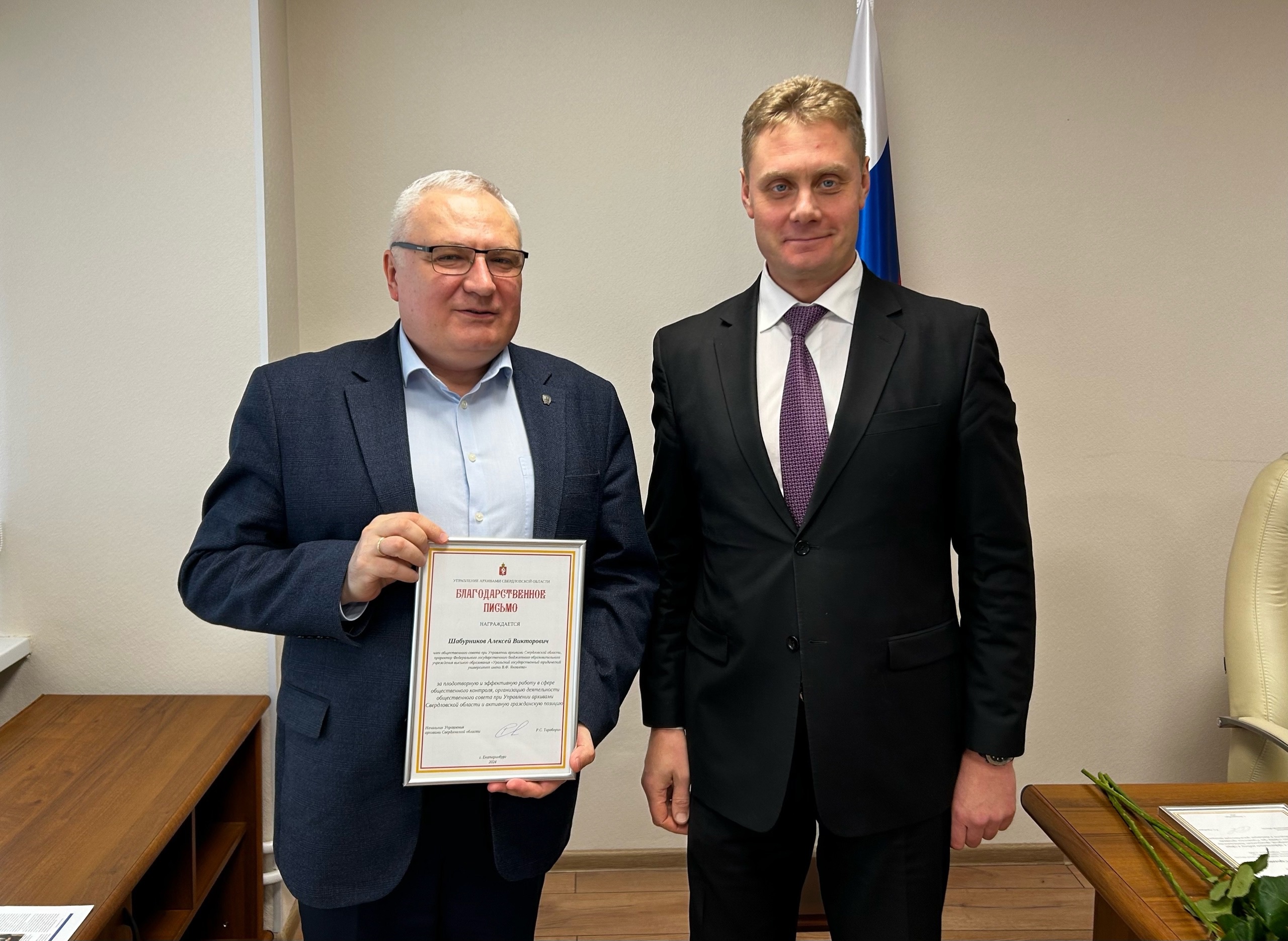 В начале заседания Роман Сергеевич Тараборин поблагодарил членов общественного совета за высокий уровень общественного контроля и вручил благодарственные письма Управления архивами Свердловской области.