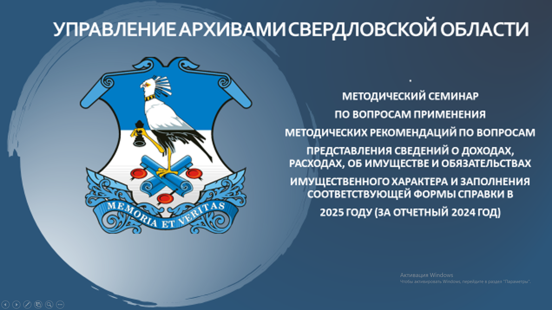11 марта 2025 года Управлением архивами Свердловской области организован очный методический семинар (с возможностью подключения в режиме видеоконференцсвязи) по вопросам применения Методических рекомендаций по вопросам представления сведений о доходах, расходах, об имуществе и обязательствах имущественного характера и заполнения соответствующей формы справки в 2025 году (за отчетный 2024 год).
