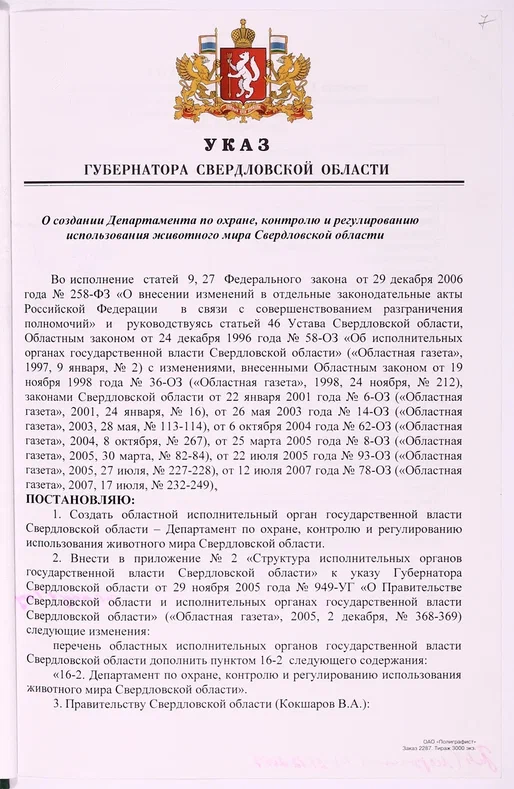 Указ Губернатора Свердловской области «О создании Департамента по охране, контролю и регулированию использования животного мира Свердловской области. 27 декабря 2007 года.