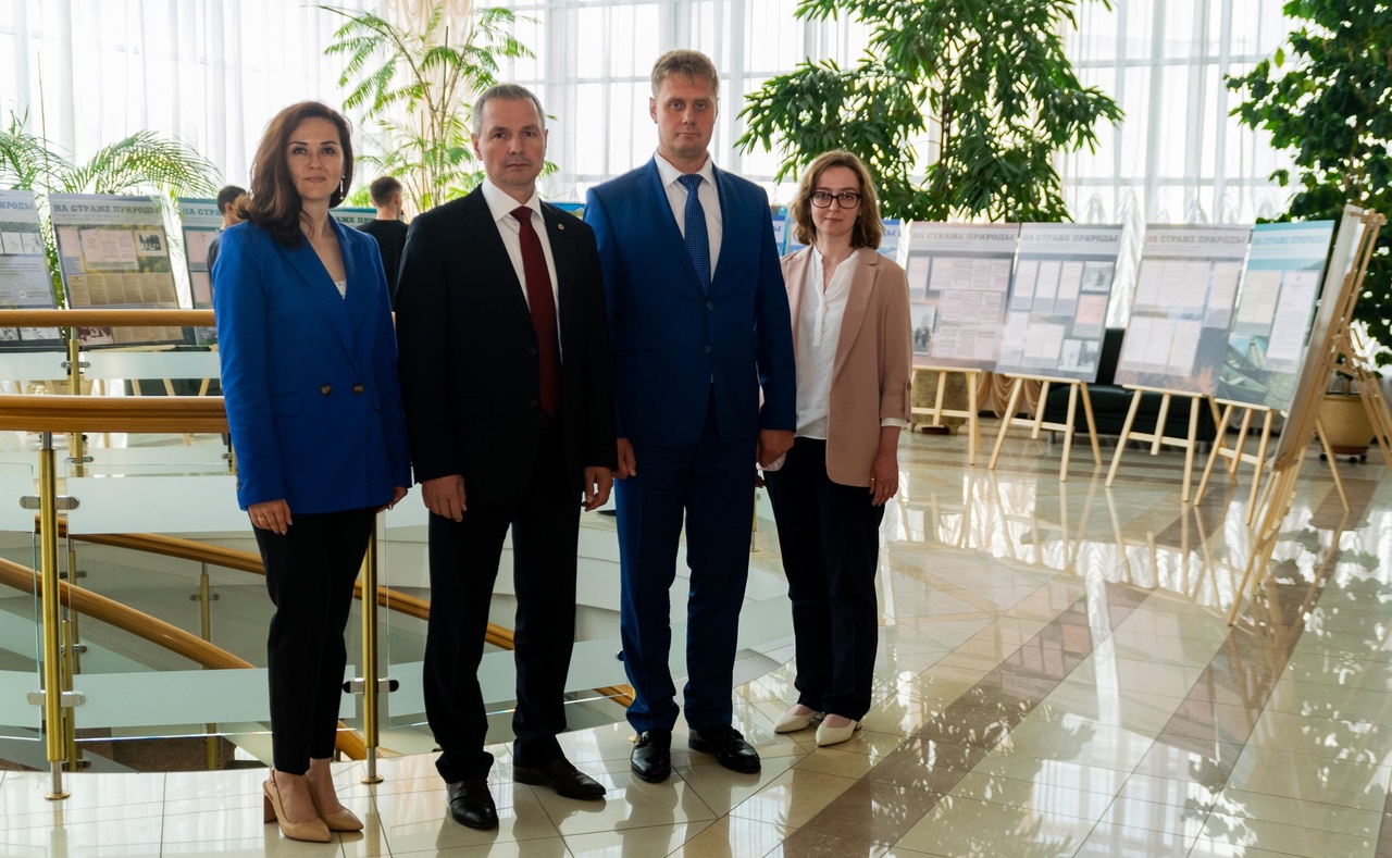 Слева направо: Директор Государственного архива Свердловской области Анастасия Александровна Константинова, Директор Департамента по охране, контролю и регулированию использования животного мира Свердловской области – главный государственный инспектор Свердловской области, заместитель председателя совета Александр Константинович Кузнецов, Начальник Управления архивами Свердловской области Роман Сергеевич Тараборин,Научный сотрудник отдела научно-исследовательской и методической работы Государственного архива Свердловской области» Валентина Олеговна Минеева на открытии выставки "На страже природы"30.06.2023