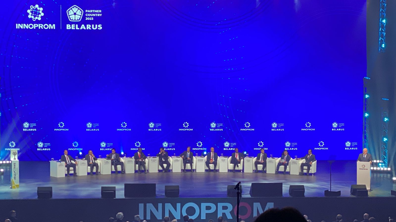 В главной стратегической сессии «Устойчивое производство. Стратегия обновления» Международной промышленной выставки «Иннопром-2023 приняли участие председатель правительства России Михаил Мишустин вместе с премьер-министром Белоруссии Романом Головченко и премьер-министром Казахстана Алиханом Смаиловым. Среди гостей выставки также вице-премьер — министр промышленности и торговли Денис Мантуров, вице-премьер Алексей Оверчук, министр здравоохранения Михаил Мурашко, мэр Москвы Сергей Собянин, губернатор Московской области Андрей Воробьев.