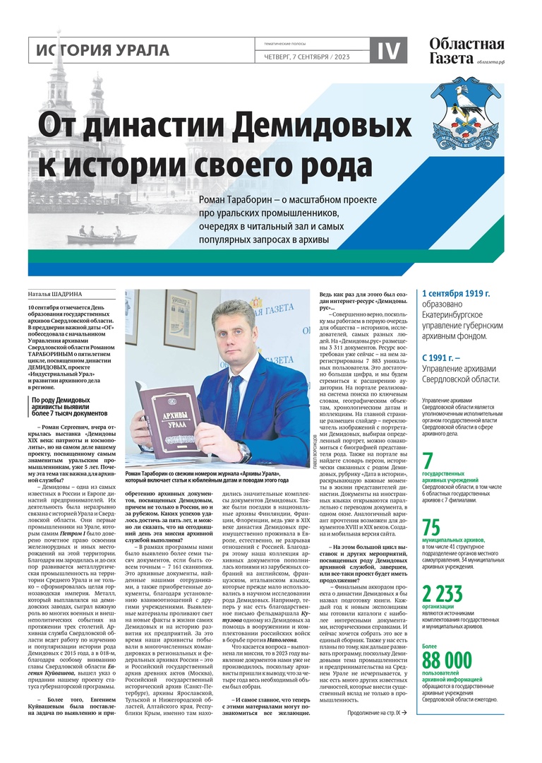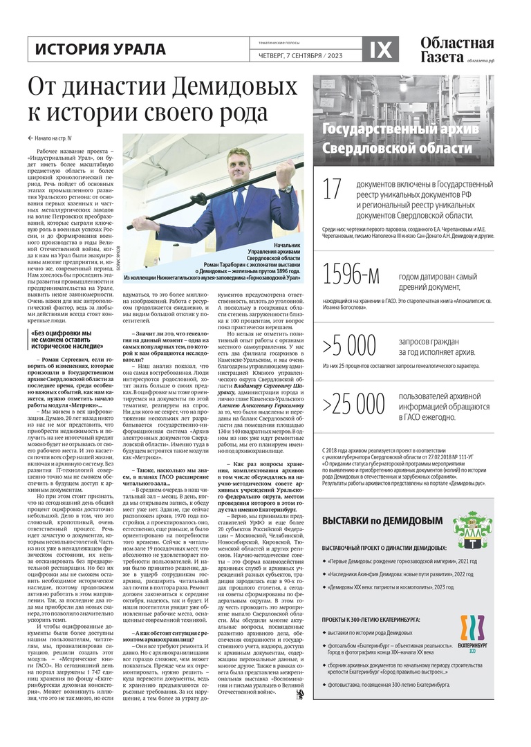 В преддверии важной даты "Областная газета" побеседовала с начальником Управления архивами Свердловской области Романом Тарабориным о династии ДЕМИДОВЫХ, проекте "Индустриальный Урал" и развитии архивного дела в регионе.